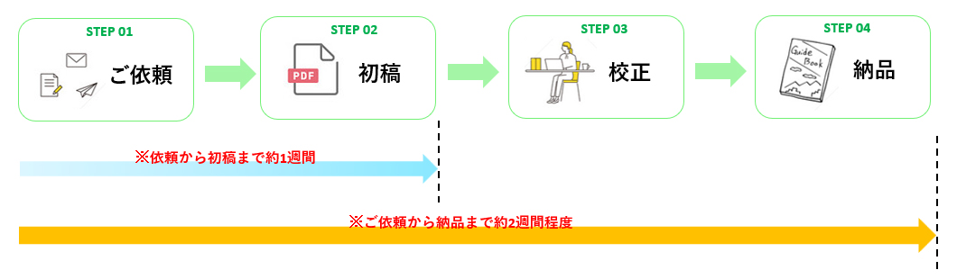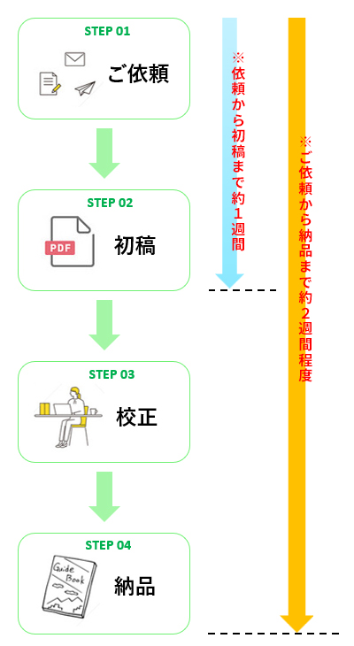 ※校了締切日は校正時に確認・確定となります。校了が締め切り日時を過ぎますと、納期遅れや割増料金が発生いたしますので、予めご了承願います。 - STEP 04